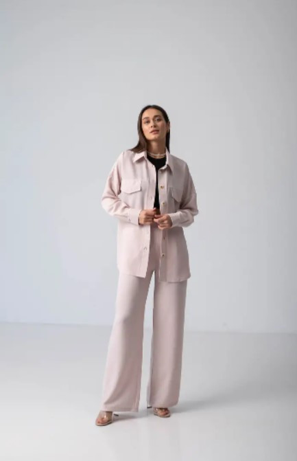 Костюм складається з брюк-палаццо та подовженої сорочки прямого крою.