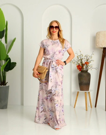 Довга сукня, літня в пудровому кольорі принтована трояндами "Аліна". Розміри 52-54, 56-58