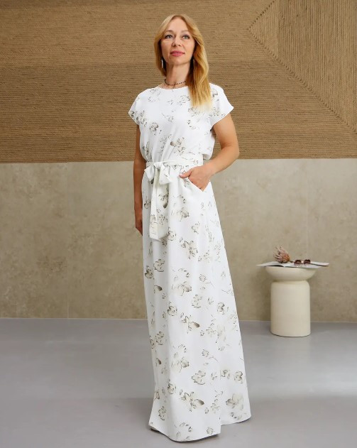 Довга сукня, літня в молочному кольорі з бежевими квітами "Аліна". Розміри від 44 до 58